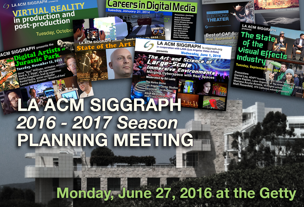 The annual Chapter planning meeting is in June where the events for next season are discussed and planned. This is your opportunity to get an event on your favorite topic. The Chapter is looking for ideas for events and people to help produce them. This year's meeting will be graciously hosted by Getty in their main facility overlooking Westwood.