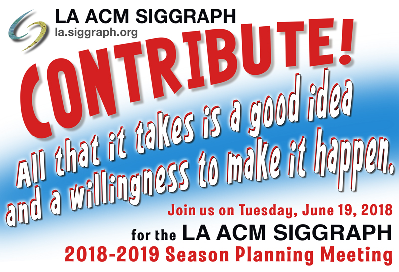 The planning meeting for the 2018-2019 season develops and identifies the ideas for our next season. We are looking for people with ideas for event and people who are willing to volunteer to make the ideas happen. RSVPs are required. This meeting is open to all members of the Chapter. We want people with event ideas to attend and contribute. To help us manage the ideas, please submit them on the contact page or send an emai to los-angeles-chapter@siggraph.org. Please include as many items in the list below as you can: