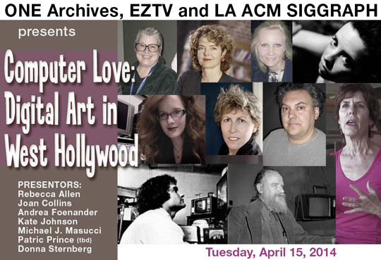 Computer Love: Digital Art in West Hollywood and in conjunction with the exhibition EZTV: Video Transfer, this panel discussion will consider the history of computer art in Southern California and its relationship to digital media and large-scale projection art today. 6:30pm Artist’s Reception followed by the 7:30pm Panel in the West Hollywood Library’s City Council Chambers