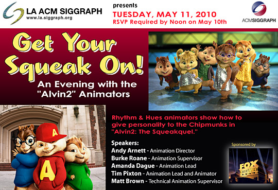 Rhythm & Hues animators show how to give personality to the Chipmunks in "Alvin2: The Squeakquel". You must RSVP to attend - click to see details.