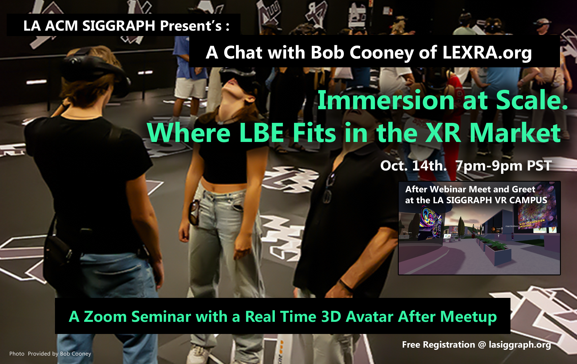 A Webinar Presentation with Bob Cooney of Lexra.org on the past/ present and future of Location based XR Entertainment and Experiences. With Meta, Snap, Google and others now selling AR - XR glasses as well as XR HMDs its a great time to learn more about how XR outside of the home is offering new opportunities in computer graphics and tech/media jobs.