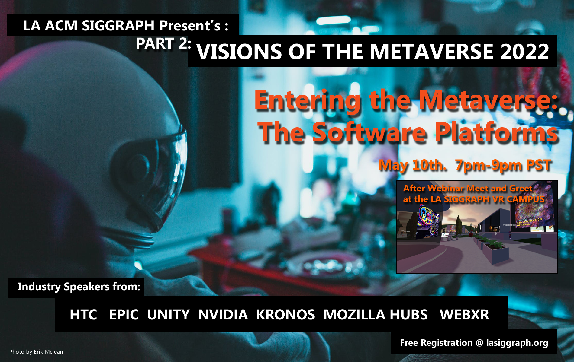 Join Host/Moderator Larry Rosenthal, Vice Chair of LA Siggraph as they welcome Industry Leaders from the Companies that are creating, building and selling the tools for the Metaverse. April's webinar will focus on the Hardware systems and May's webinar will focus on the Software and tool Platforms. Both Webinars will be presented via Zoom and have a Live VR Meet and Greet afterwards online in the LA SIGGRAPH VR Campus.
