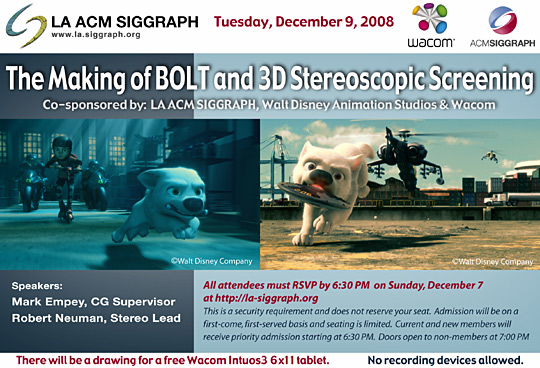 All LA ACM SIGGRAPH will be admitted free of charge. Non-members of LA ACM SIGGRAPH are admitted for $20.00. New LA ACM SIGGRAPH members who sign up on-site, and pay the $40 annual membership fee (checks or cash only), do not have to pay the $20 admission fee.