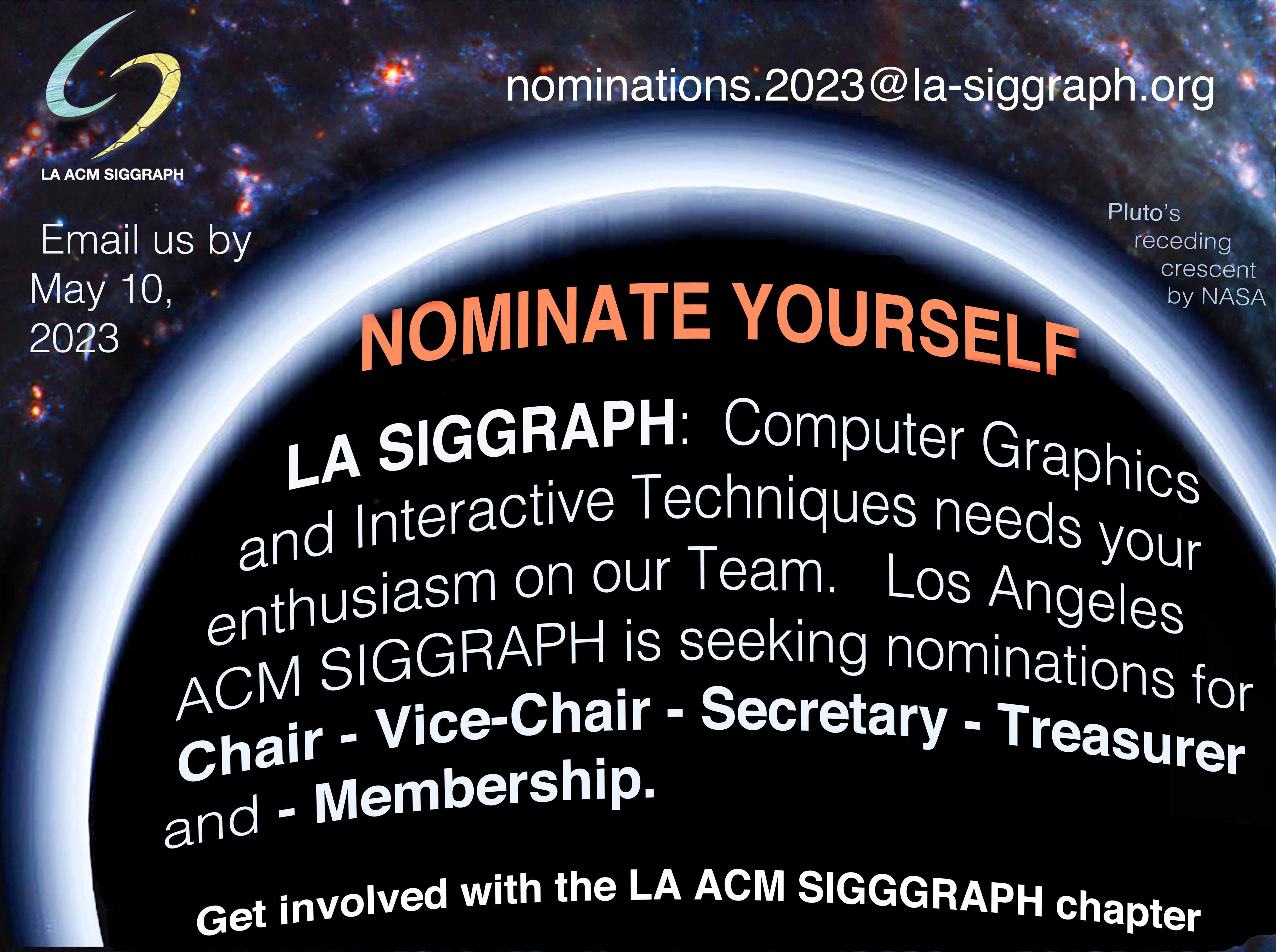 Nominate yourself, or someone you know. Nominations are due by MAY 10 2023. Send an email to nominations.2023@la-siggraph.org OR contact someone in the Executive Council.