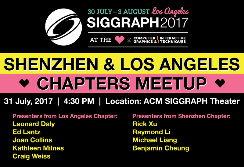 Members of the Los Angeles and Shenzhen ACM SIGGRAPH Chapters meet to discuss common interests and goals. Leonard Daly, past Chair LA ACM SIGGRAPH and Rick Xu, Chair Shenzhen ACM SIGGRAPH will host the afternoon meetup with presentations by selected members of both chapters. The primary presentation topics are listed below with each chapter providing their unique expertise in each of those areas. Sign up on Meetup for your commemorative badge. Shenzhen Presenters * Rick Xu (Chapter Chair): Intro of Shenzhen Chapter, overview of the CG industry - mainly about education, researches, animation and games in Shenzhen * Raymond Li: Quick Introduction of Visualization for architecture and urban construction planning in Shenzhen * Michael Liang: Foreign entrepreneurs in China CG Market * Benjamin Cheung: Animation/VFX Production in Shenzhen and China LA Chapter Presenters * Leonard Daly (Past Chair): Intro of LA Chapter * Ed Lantz (Chair): Future CG in Entertainment * Joan Collins (Chair Emeritus): History of Chapter and ACM SIGGRAPH * Kathleen Milnes (LA Chapter Education): Education of CG * Craig Weiss (Head, CBS Digital): Merging Live Action and CG in VR Environments