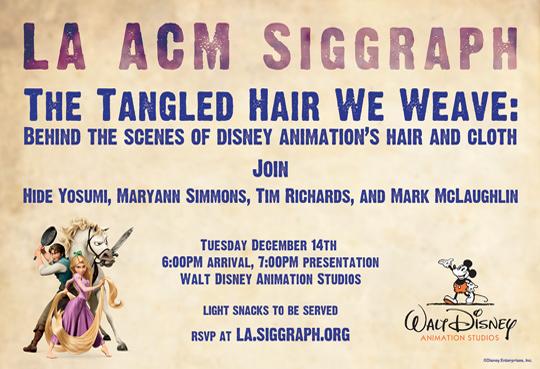 A Saturday joint event with the Visual Effects Society (VES) for a screening of Disney's "Tangled". This event is only open to current LA ACM SIGGRAPH Chapter members plus one guest per member.